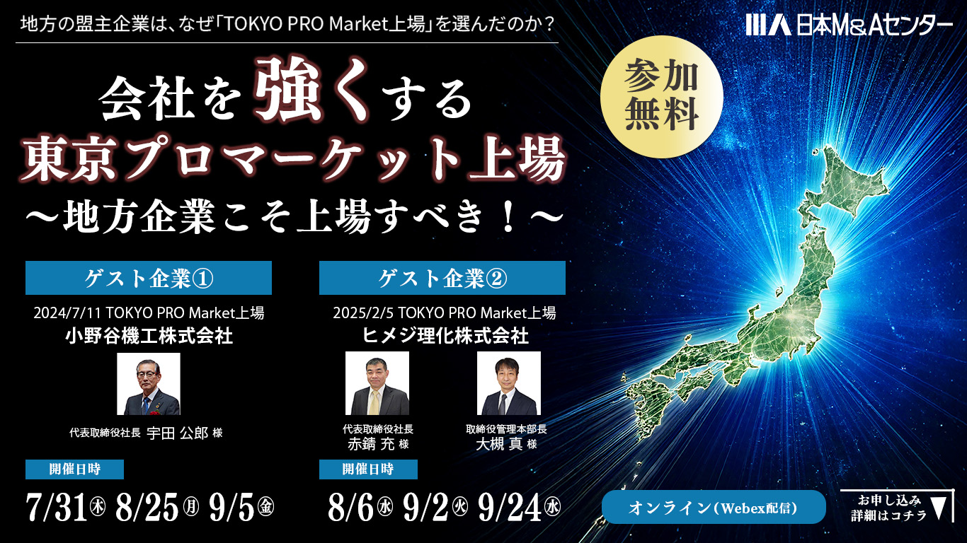 この度日本M&Aセンターでは、2025/7/31より全6日程で、オンラインセミナー『会社を強くする東京プロマーケット上場 ~地方企業こそ上場すべき!~』を開催いたします。(開催時間は全日程とも13:00~14:00です。)