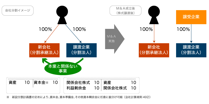 譲渡企業の非事業用資産や譲渡対象外としたい事業を分割型分割により新会社やオーナー保有の別会社へ税負担なく切り離した後、譲渡企業株式を譲渡することで、次のような効果が考えられます。