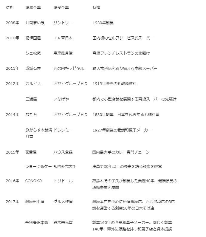 老舗の食品メーカーや伝統ある外食企業の存亡の危機を回避するべく、大手企業がそれらの企業を傘下に収める事例が増えてきている。