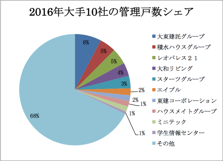 最大手の大東建託はひとつ抜けているものの、管理戸数ベースでは、シェアの約8%にとどまるため、覇権争いの余地は残ります。