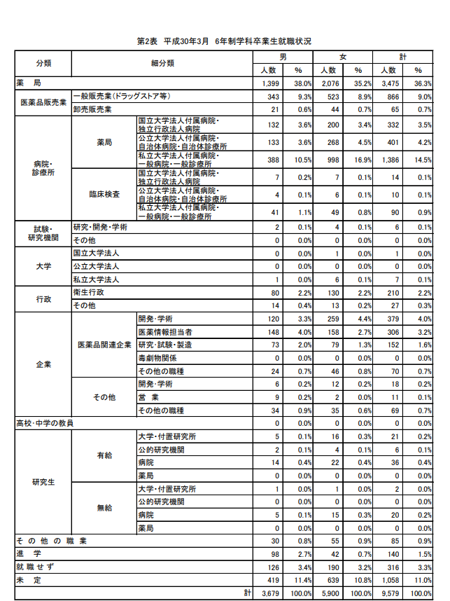 薬学教育協議会のデータによると、2018年3月に6学制学科の卒業生のうち薬局に就職したのは3,475名(36.3%)、ドラッグストアなどの一般販売業に就職したのが866人(9.0%)であり、合わせて4,341人であった。