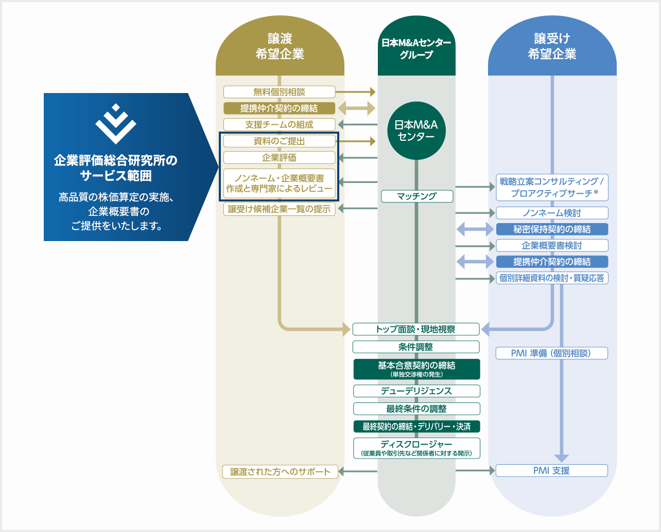企業評価総合研究所は、企業評価と企業概要書作成の専門会社として、日本M&Aセンターからこれらの業務の委託を受けて行っています。企業評価総合研究所のサービス範囲は、以下の通りです。