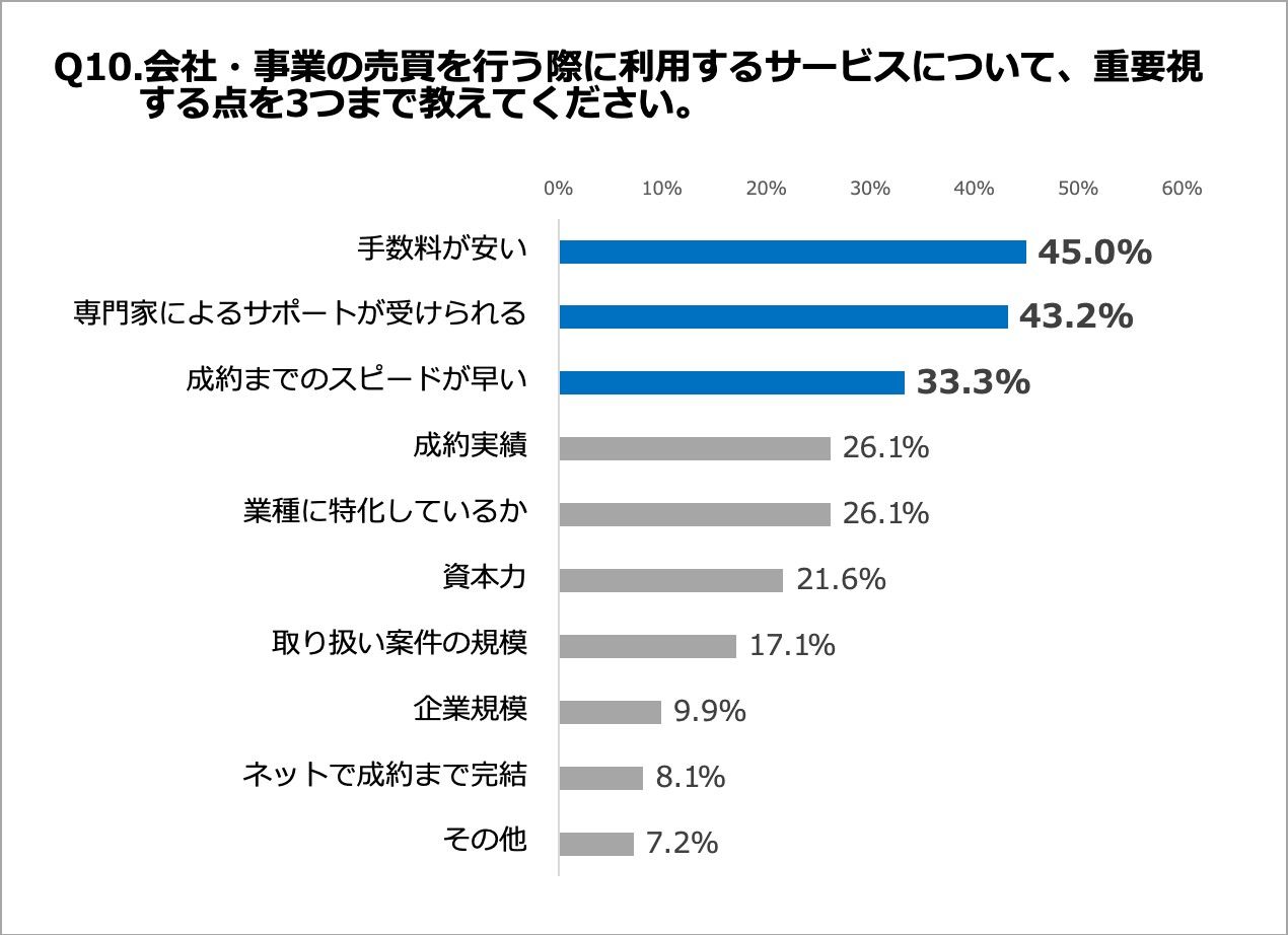 「Q10. 会社・事業の売買を行う際に利用するサービスについて、重要視する点を3つまで教えてください。」(n=111)と質問したところ、「手数料が安い」が45.0%、「専門家によるサポートが受けられる」が43.2%となりました。