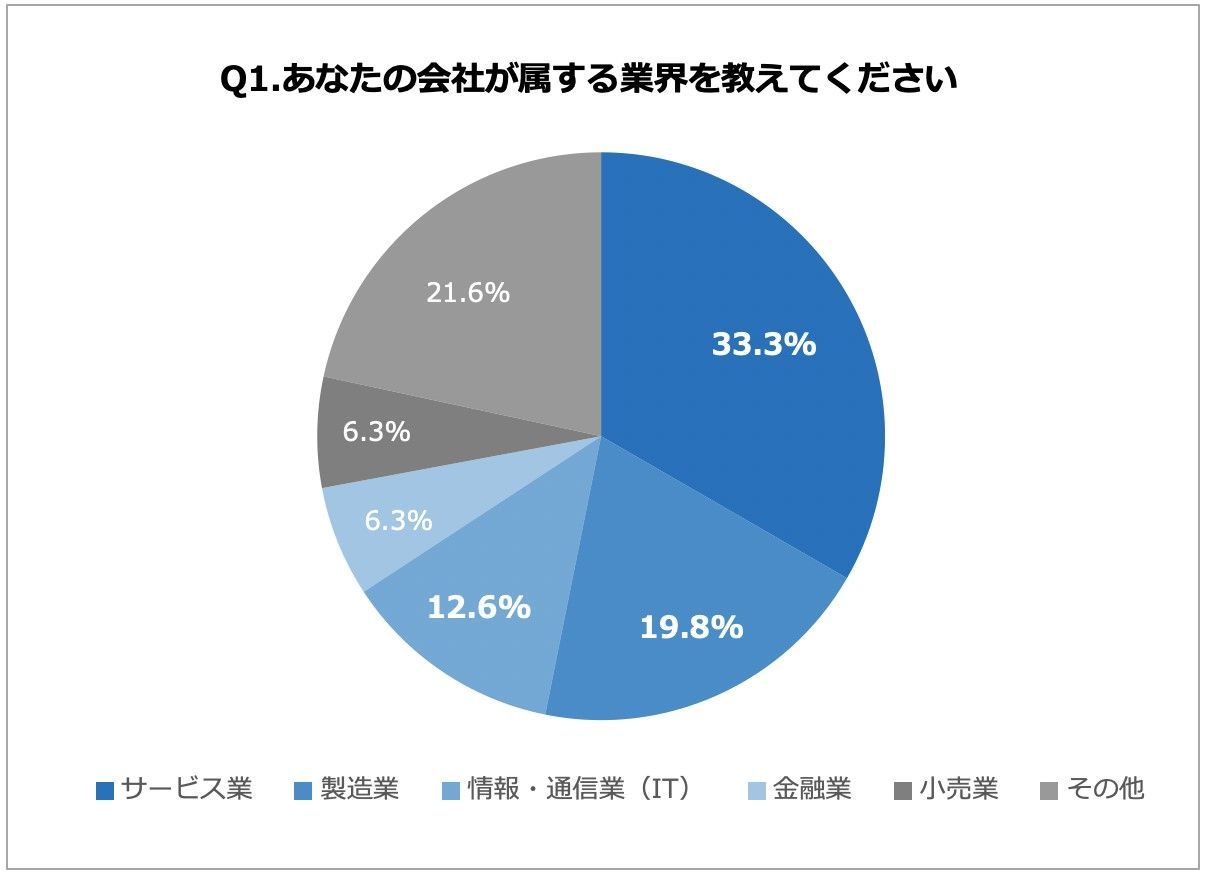 「Q1. あなたの会社が属する業界を教えてください。」(n=111)と質問したところ、「サービス業」が33.3%、「製造業」が19.8%という回答となりました。