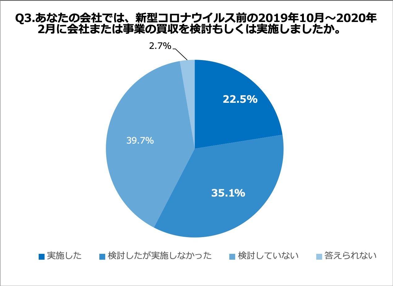 「Q3. あなたの会社では、新型コロナウイルス前の2019年10月~2020年2月に会社または事業の買収を検討もしくは実施しましたか。」(n=111)と質問したところ、「実施した」が22.5%、「検討したが実施しなかった」が35.1%という回答となりました。