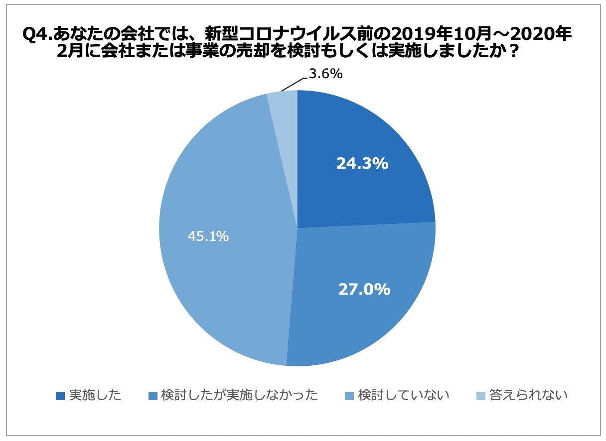「Q4. あなたの会社では、新型コロナウイルス前の2019年10月~2020年2月に会社または事業の売却を検討もしくは実施しましたか」(n=111)と質問したところ、「実施した」が24.3%、「検討したが実施しなかった」が27.0%という回答となりました。