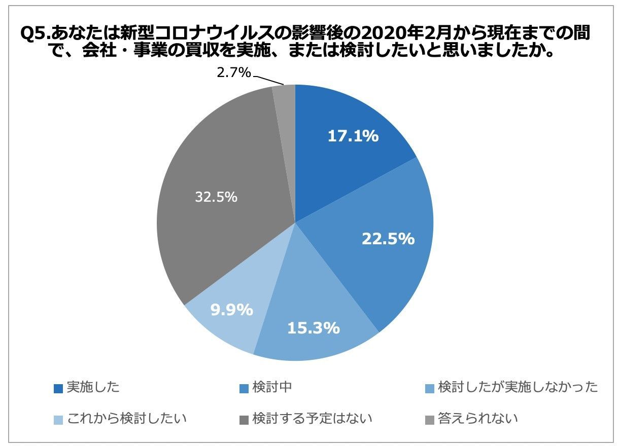 「Q5. あなたは新型コロナウイルスの影響後の2020年2月から現在までの間で、会社・事業の買収を実施、または検討したいと思いましたか。」(n=111)と質問したところ、「実施した」が17.1%、「検討中」が22.5%、「検討したが実施しなかった」が15.3%、「これから検討したい」が9.9%という回答となりました。