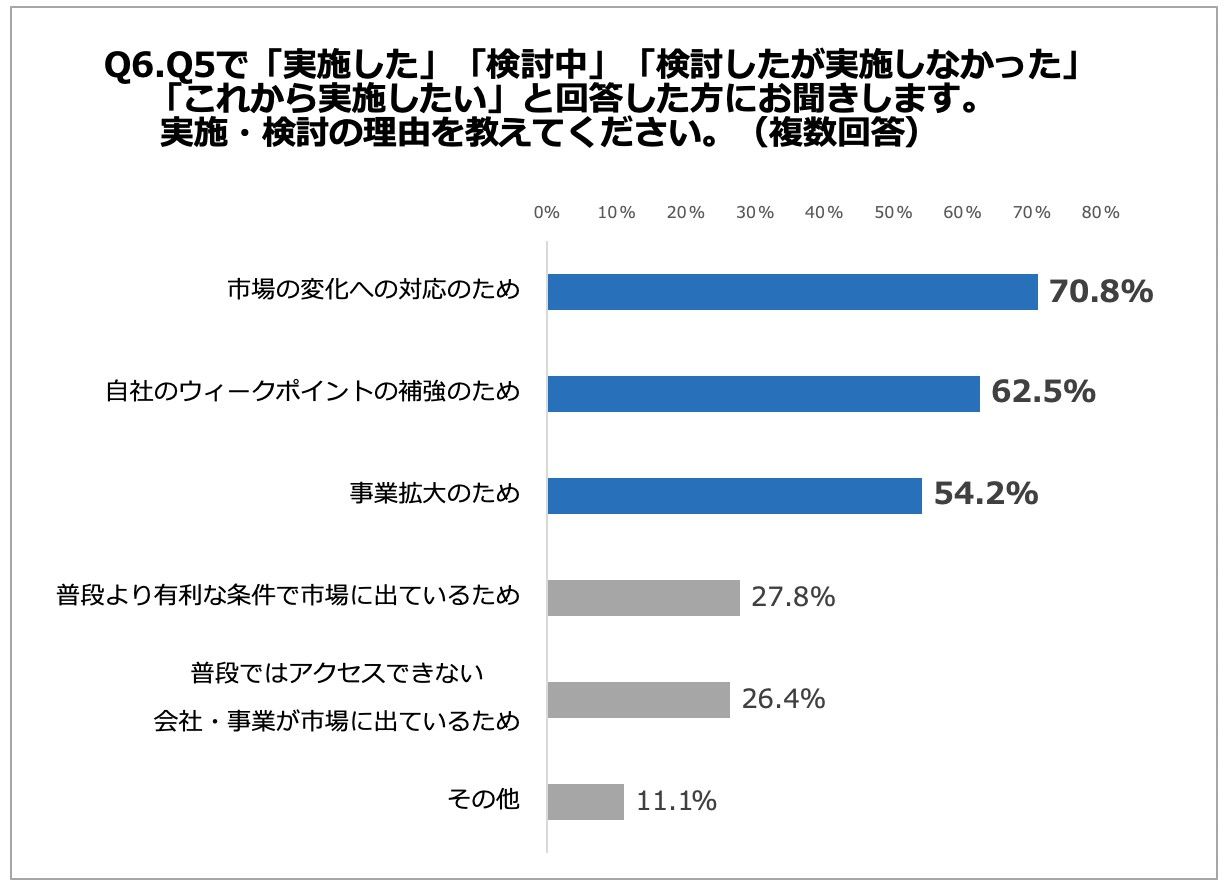 Q5で「実施した」「検討中」「検討したが実施しなかった」「これから検討したい」と回答した方に、「Q6. 実施・検討の理由を教えてください。」(n=72)と質問したところ、「市場の変化への対応のため」が70.8.%、「自社のウィークポイントの補強のため」が62.5%、「事業拡大のため」が54.2%という回答となりました。
