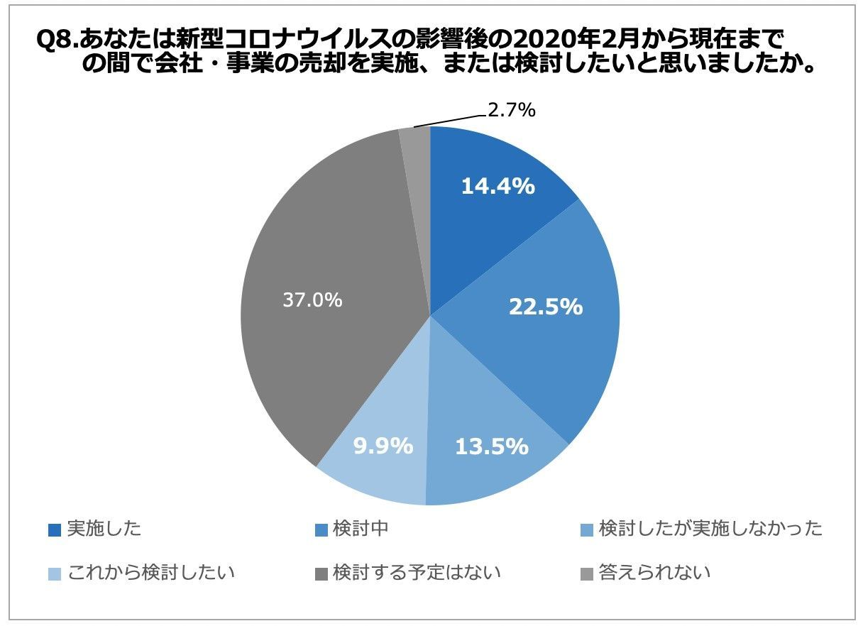 「Q8. あなたは新型コロナウイルスの影響後の2020年2月から現在までの間で、会社・事業の売却を実施、または検討したいと思いましたか。」(n=111)と質問したところ、「実施した」が14.4%、「検討中」が22.5%、「検討したが実施しなかった」 が13.5%、「これから検討したい」が9.9%という回答となりました。