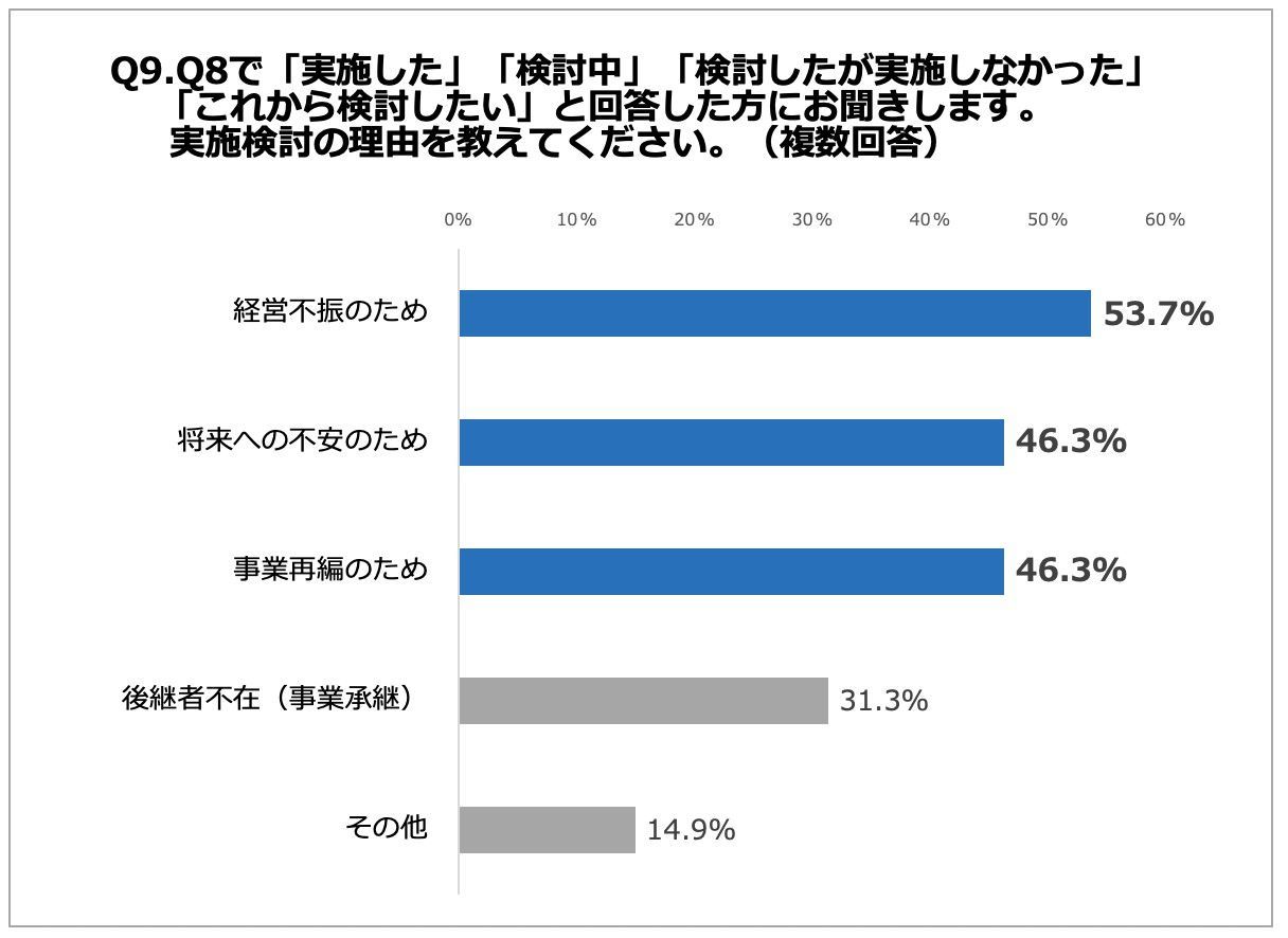 Q8で「実施した」「検討中」「検討したが実施しなかった」「これから検討したい」と回答した方にお聞きします。「Q9.実施・検討の理由を教えてください。」(n=67)と質問したところ、「経営不振のため」が53.7.%、「将来への不安のため」が46.3%、「事業再編のため」が46.3%という回答となりました。