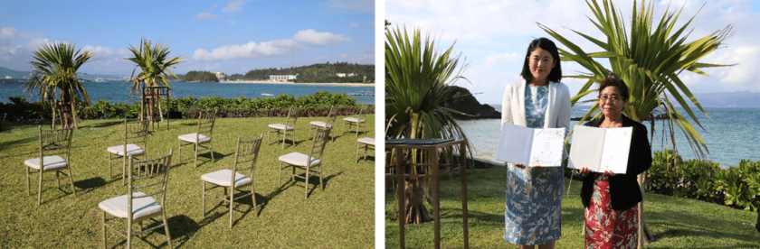 今回は、両社のコーポレートカラーで揃えた「かりゆし」(沖縄では“めでたい”を意味する言葉)のシャツやワンピースを着用し、会場を飾るテーブル装花もコーポレートカラーで揃え、一体感を醸成させました。