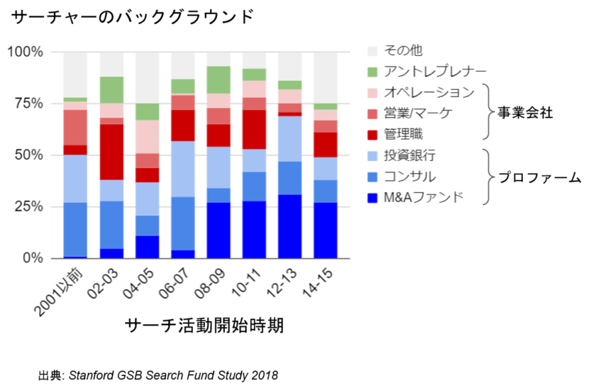 またサーチャーのバックグランドとしては、2002年以前のサーチファンドでは、コンサルティングファームや投資銀行出身のサーチャーが多かった。これが、2008年以降になると、M&Aファンド(プライベートエクイティファンド)出身のサーチャーが増えてくる。