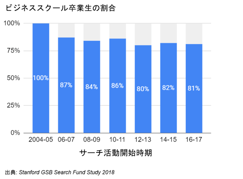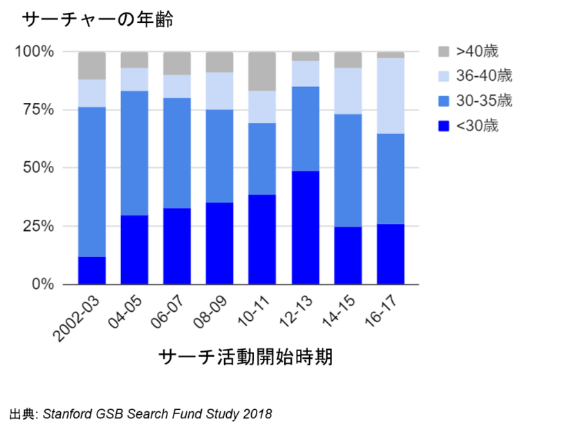 アメリカのサーチファンドに関する調査によると、黎明期から現在に至るまで、サーチャーの約8割がビジネススクール卒業生で、年齢的には30歳台が中心である。