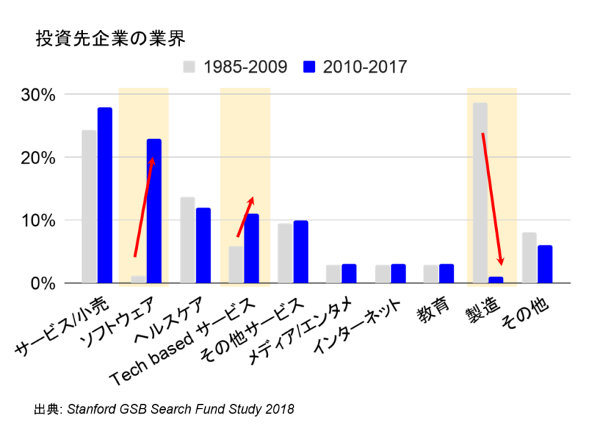 業種・業界については、サーチファンドだからといった大きな傾向や制約は見受けられないように思う。世の中のトレンドに応じて、成長可能性のある業界への投資が模索されていると推測される。