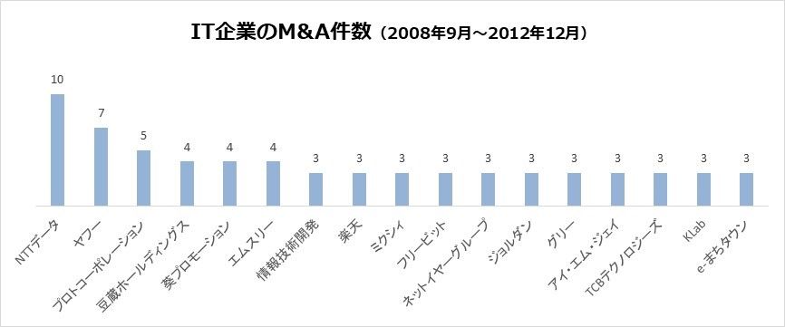 不況時でもM&Aを積極活用して成長を実現させてきた企業は数多く存在する。次の図はリーマンショックの際の不況時(2008年9月~2012年12月)のIT企業の買収(子会社化)件数上位企業だ。多くの企業が積極的にM&Aを成約させていたことがわかる。中でもNTTデータは4年3ヶ月の間に国内だけで10件のM&Aを成約させている。