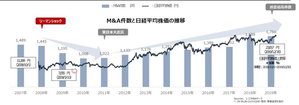 2008年にリーマンショックが発生した際は、M&A件数は大きく減少した。その後、2011年に発生した東日本大震災の影響もあって、復調にはリーマンショック後約3年の歳月を要することになった。