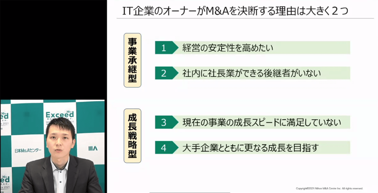 IT企業のオーナーがM&Aを決断する理由は、社内に後継者がいない事業承継型と成長スピードを加速させるために大手企業と手を組む成長戦略型の大きく2つに分けられます。日本M&AセンターによるIT業界の成約実績では、受託開発ソフトウェア業が半数を占めます。受託開発ソフトウェア業は約30年前に独立したオーナーが多く、高齢化と事業承継のタイミングが重なっています。また、社内のナンバー2が経営者を希望しない場合も多いと室井は指摘します。自社サービスを持たない受託開発が中心のため、社長への依存度が高いことも事業承継を難しくさせ、M&Aが多い要因となっていると分析します。