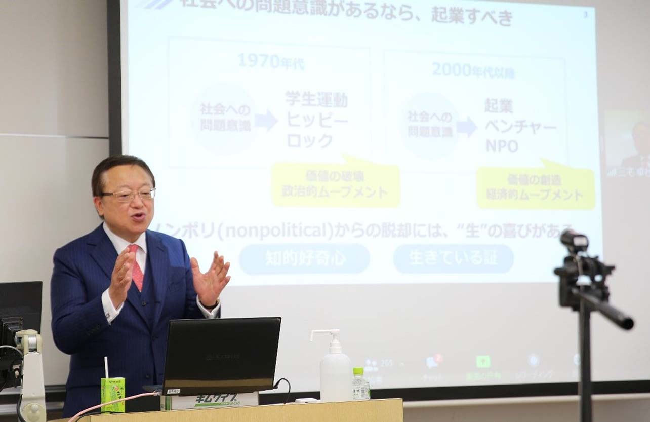 講座は起業志向の学生に、起業家としての考え方や知識を身につけるノウハウを提供し、アントレプレナー(起業家精神)の醸成と人材育成を図ることが目的です。新型コロナウイルスの影響で、オンライン授業となりましたが、約300人の学生が受講しました。新様式の講義でもリアルタイムにレベルの高い多数の質問がチャットで寄せられ、質疑応答もあり、白熱した授業となりました。