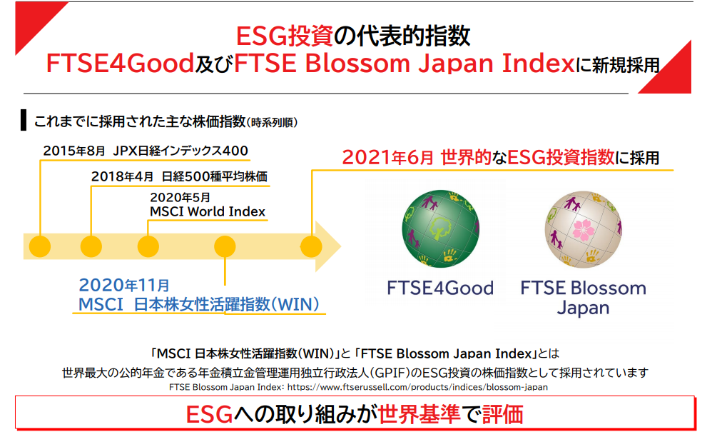 しかしながら社内でいかにESG課題への取り組みを進めても、その取り組みをうまく開示して外部に認識してもらえなければ評価スコアには反映されません。そのため、コーポレートサイト内に新たにサスティナビリティの枠を設けて、日本語と英語表記で開示しました。このようなさまざまな取り組みの成果と情報開示により、結果として評価スコアを3.8点にまで上げることができ、この度構成銘柄に採用されることができました。
