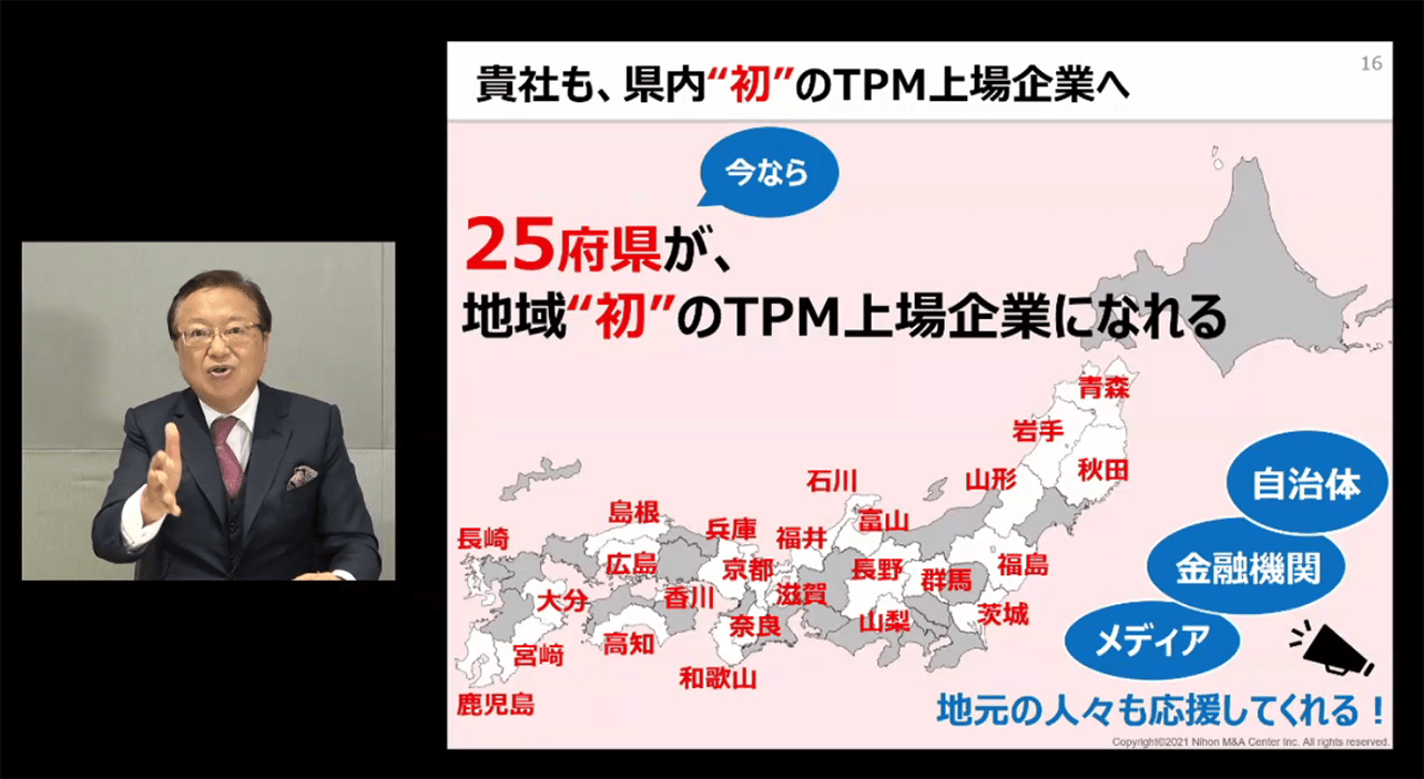 2部構成のセミナーの1部では、日本M&Aセンター代表取締役社長の三宅卓が、成長を加速させる上場のメリットを実体験に基づいてお伝えしました。2006年にマザーズに上場(2007年東証一部上場)した日本M&Aセンターを事例に、「上場することで信用が上がり、優秀な人材が入ってくる。そうすると会社の成長が爆発的に加速する」と強調します。また「社員も上場企業で働くことの誇りと気概を持つことができる」と振り返ります。上場することで企業のガバナンス強化にもつながり、経営者によるワンマン経営から組織経営に移行することで、飛躍的な成長を実現できます。多くの中小企業が、新たな経営戦略を求められているこのコロナ禍において、「今こそイノベーションのチャンス。中小企業にとって、“IPO(上場)”は会社を飛躍的に成長させる大きな武器となる」「ぜひ多くの企業にTPMに上場していただき、地域を牽引する“スター企業”になって欲しい」と力説します。 2009年に開設したTPMは2021年9月8日時点で、49社が上場。うち全国の25府県ではTPMへの上場事例がなく、府県初の上場企業になれる可能性が広がっています。地方からTPM上場企業が誕生しスター企業が増えれば、地元へのターン率も高まり、地域経済が活性化することで地方創生の実現も近づきます。
