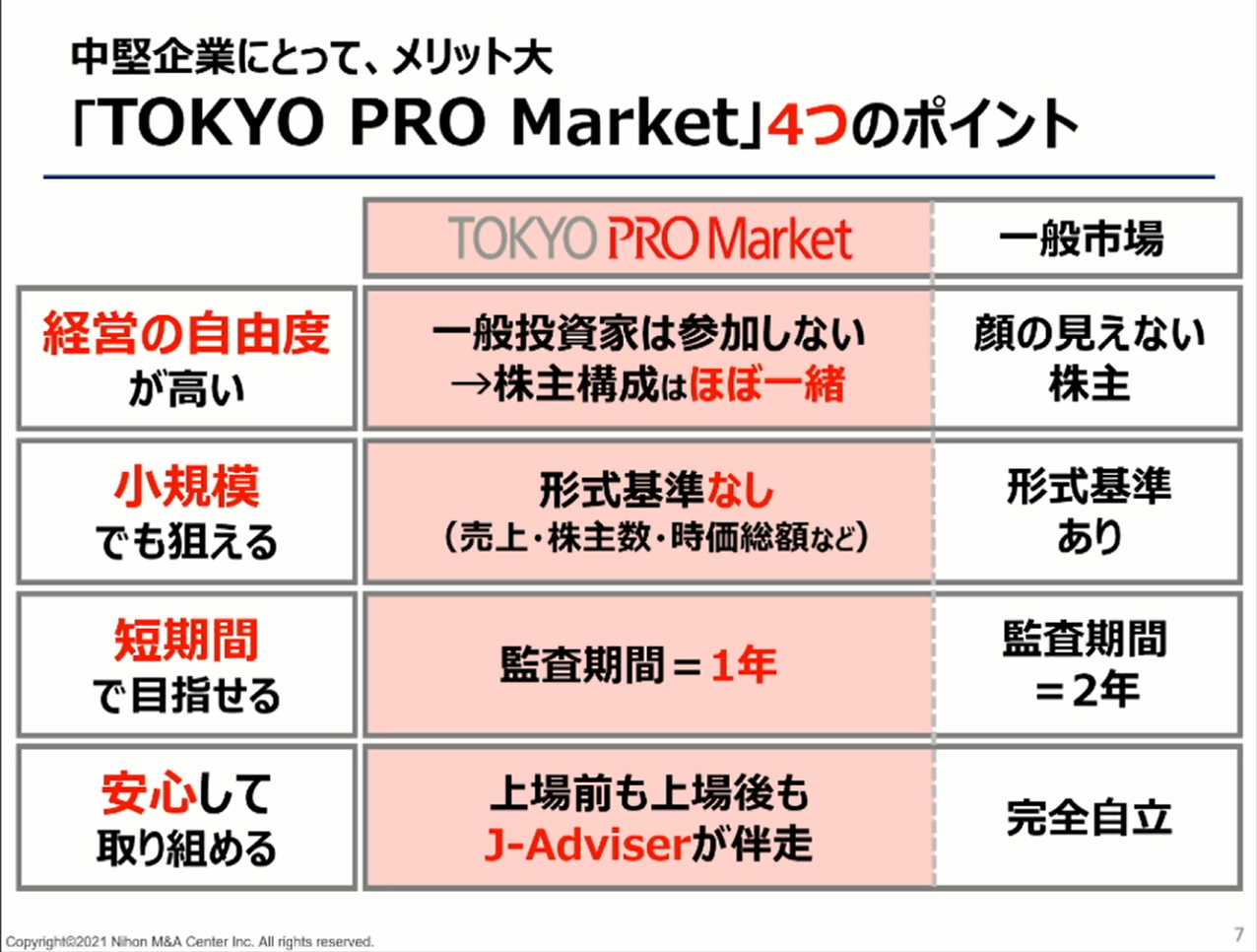 一般市場に比べて、TPMの上場基準は緩やかな基準が設定されています。上場時に必ずしも株を売り出す必要がないため、経営の自由度を維持したまま上場することができます。売上や株主数、時価総額などの形式基準がない分、門戸は広く、中堅・中小企業でも上場を狙えるマーケットです。また、一般市場では監査期間が二期分必要ですが、TPMは一期分のみと上場期間も短縮することができます。雨森は「上場準備は“簡単”ではありませんが、どの会社でもチャレンジできるため、TPM上場を目指さない手はありません」と語ります。 一般市場の上場審査は東証や証券会社が実施しますが、TPMの場合は日本M&Aセンターなど東証が認証したJ―Adviserが審査を担います。上場準備の指導と審査を一括して担当する伴走者(J-Adviser)の存在も、企業には魅力的です。上場準備期間を短縮できる分、コスト面も一般市場より抑えることができますが、「信用力・知名度の向上」「経営の透明性の向上」「組織体制の強化」など、上場メリットは一般市場と同様のものを享受できます。