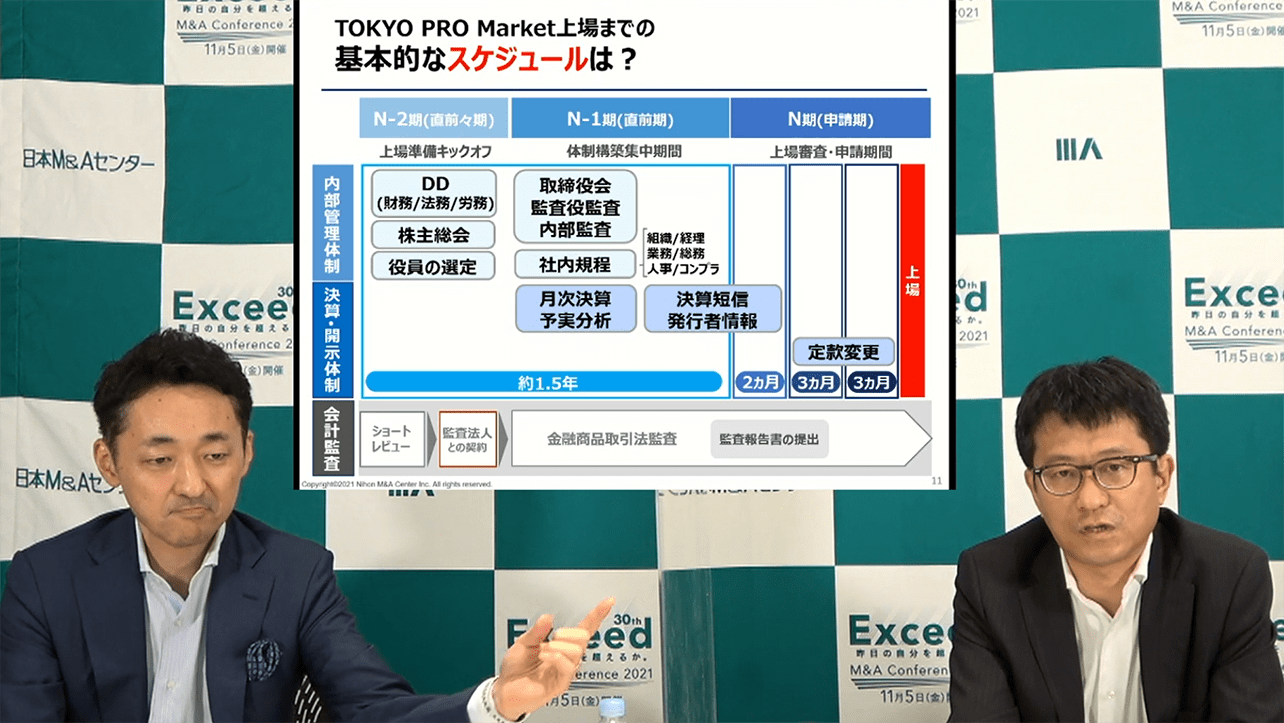 日本M&Aセンターはオンラインセミナー「TOKYO PRO Market上場準備の話~実践編」を開催しました。大きな注目を集めている東京証券取引所のプロ投資家向け市場『TOKYO PRO Market(TPM)』。日本M&AセンターはJ-AdviserとしてTPMへの上場を支援しており、本セミナーでは、日本M&Aセンター 上席執行役員 TPM事業部長の雨森良治と、上場指導・審査を担当している上場審査部の光浦正也が、経営者の知りたいスケジュール感や上場準備の実務内容を分かりやすく解説しました。