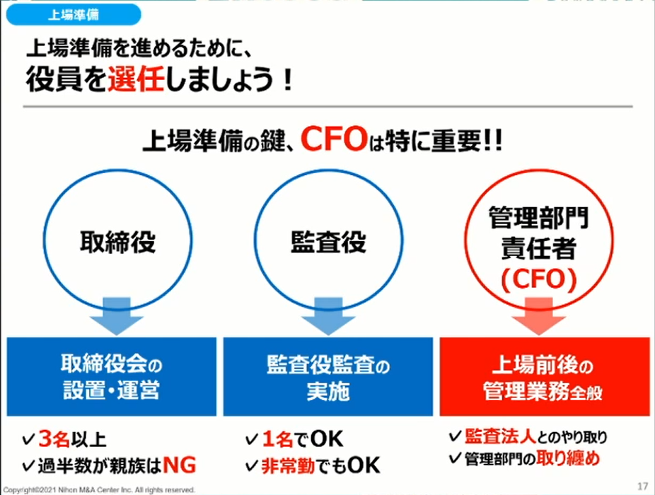上場準備で業務量が増える管理業務全般を統括するのが管理部門責任者(CFO)となります。光浦は「CFOが上場準備の鍵を握ります」と明言します。上場企業として求められる月次決算や決算短信の作成から規定・マニュアルづくり、中期計画や予算作成など経営企画に関する多種多様な業務を責任者としてコントロールしなければなりません。管理部門責任者の理想の人材として、上場準備の経験者や大企業の管理部門の業務フローを熟知した人材など経験と知見のある幹部ポストを登用できるかがポイントになります。