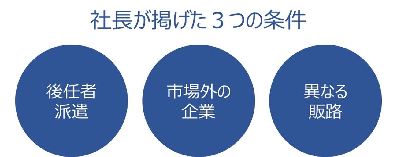 3に関しては、М&Aを通じて自社単独では実現できない成長を目指すという目的の中で、自社の商品を更に拡販できる可能性を持ったパートナーと組むのがベストではないかということで、上記の3点を軸にお相手探しをスタートしました。
