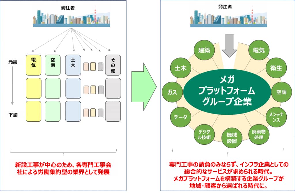 大手3グループは、近年、電気や管などの設備工事、土木・建設工事、ソフトウェア開発などの会社をグループ化している。通信インフラ建設の会社から社会インフラ全般を支える企業群へと進化を進めており、今後もメガ・プラットフォームとしての存在感を増していくことだろう。