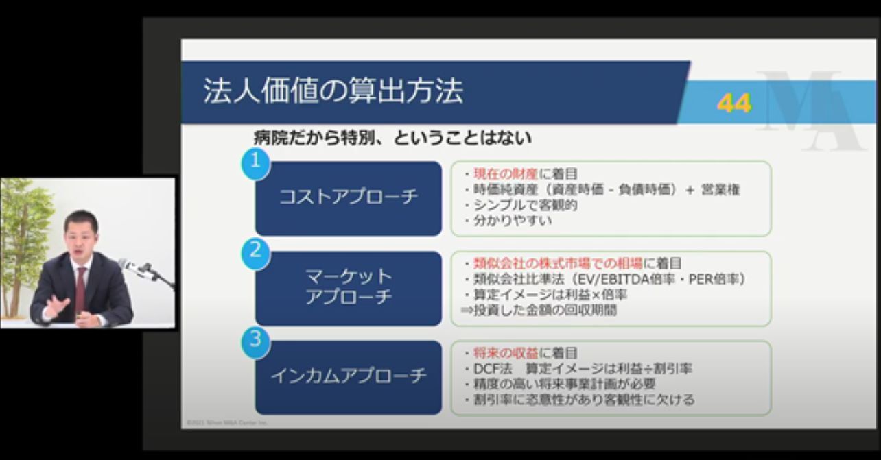 現在の財産に着目し、時価純資産に営業権を足した金額が法人価値となる。病院M&Aで、一般的に活用されている価値算定手法。