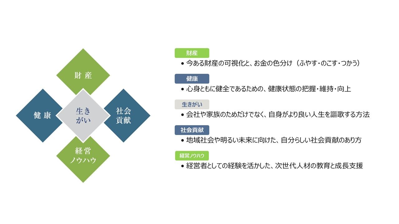その中で多くの経営者の方からあったのが経営者でない自分自身に対する不安、つまり次の人生の生きがいを何に求めればよいのか分からないということでした。私どもは経営承継、財産承継だけでなく、経営者本人の“生き方”をサポートすることで事業承継がよりスムーズに進むのではないかと考えたのです。