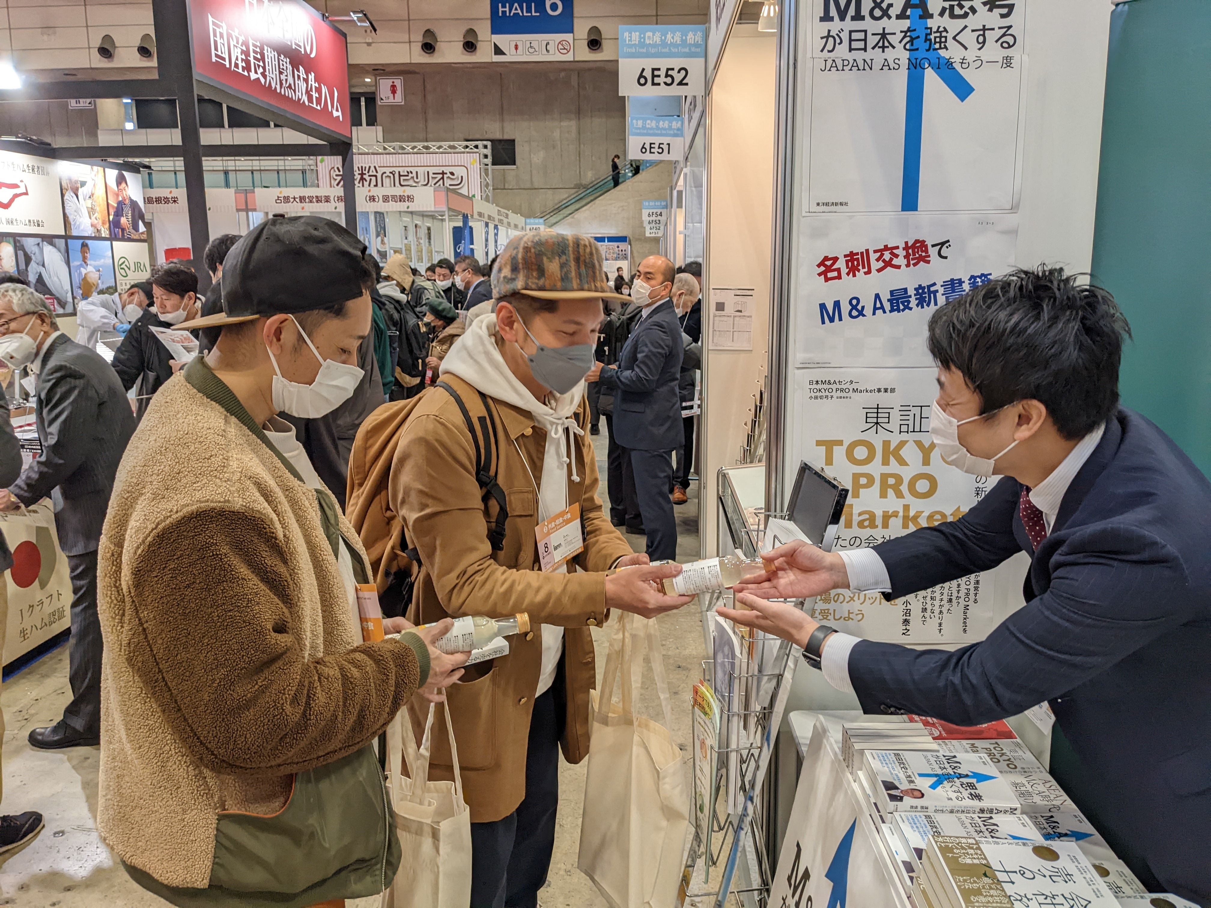 情報・サービスエリアの一角にブースを構えた日本M&Aセンターは他のブースのように食品こそ扱っていないものの、午前10時の開場から1時間程度で30人以上の来場者が足を止めて、コンサルタントと名刺交換が行われていました。日本M&Aセンターが出版した食品業界のM&Aトレンドを紹介する書籍を配り、互いの会社紹介にも花が咲いていました。