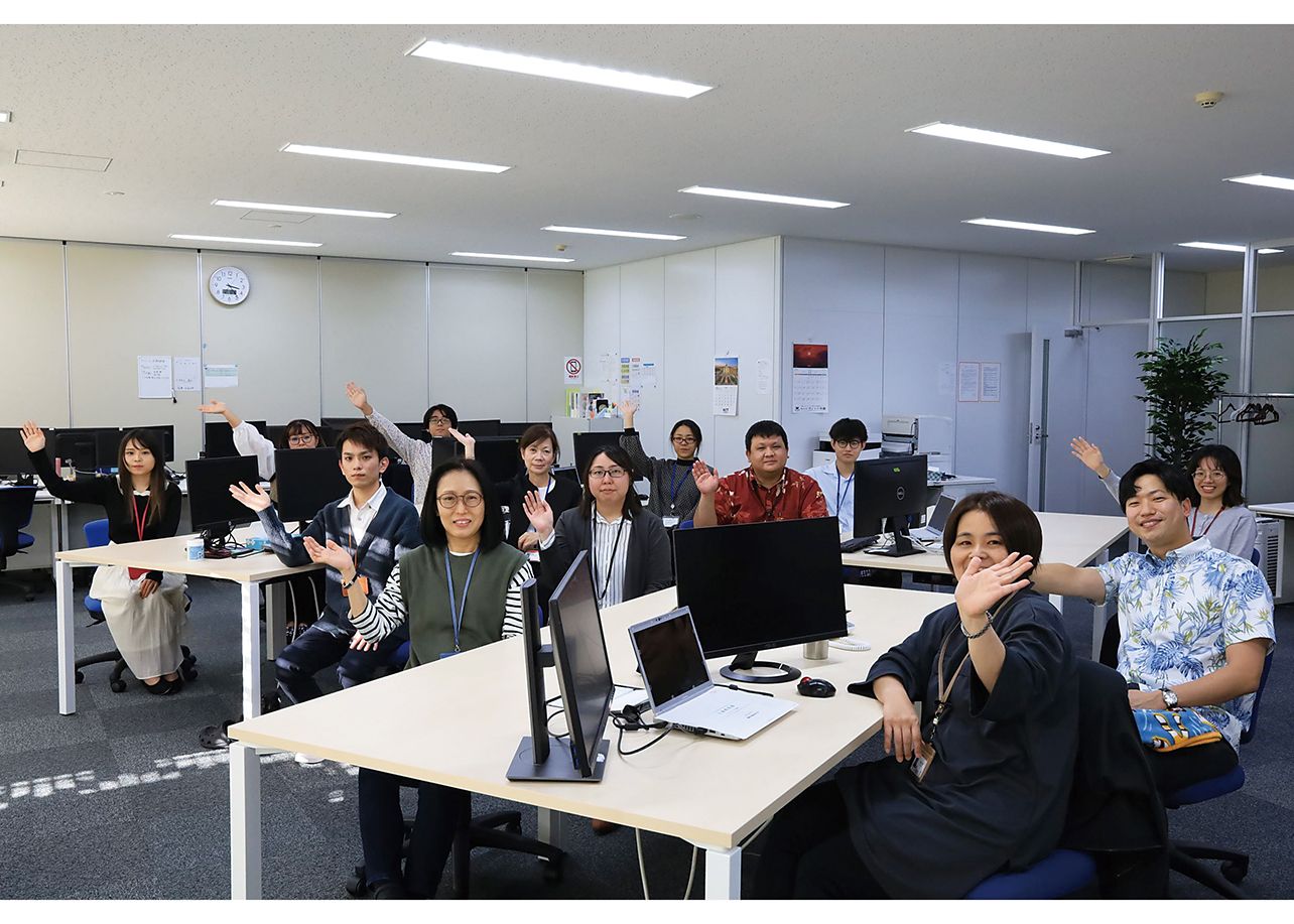 沖縄IT津梁パーク内にある「うるまオフィス」の皆さん。和気あいあいとした雰囲気で働いている
