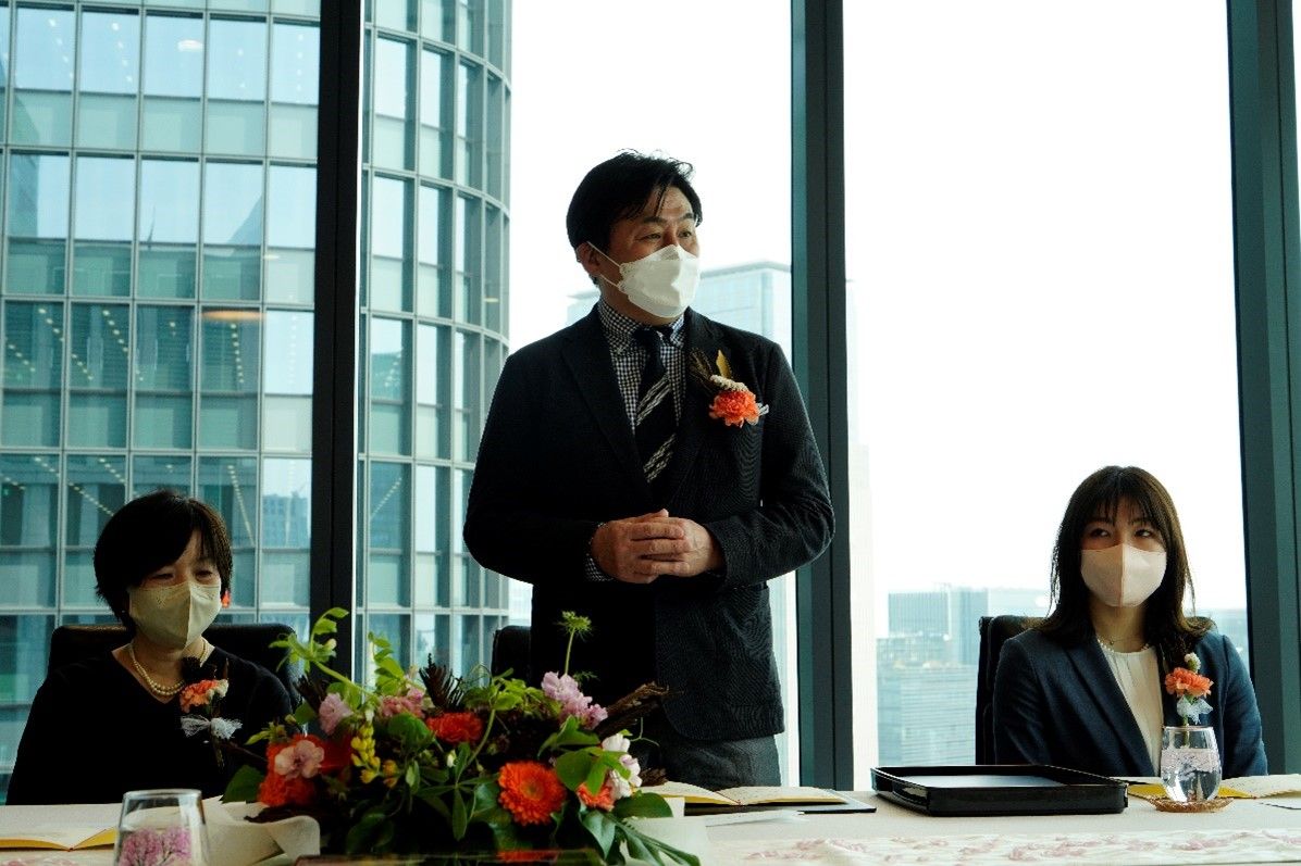 この日、日本M&Aセンター本社で行われたM&A成約式では、克也氏を隣で支え続けた妻で取締役の久子氏、息子の陸氏、娘の也子氏が参加し、克也氏の32年間の努力と苦労をねぎらい、感謝の言葉を紡ぎました。