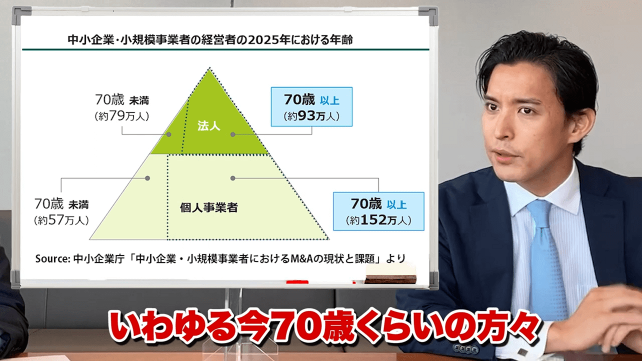 岡本: 実際70歳以上の経営者の方が約3年後に245万人にまで増加する、というデータも中小企業庁から出ています。少子高齢化の問題は中小企業の経営者にも当てはまる話で、国内の人口動態の中で一番のボリュームゾーンにいるのが、この団塊の世代、今70歳前後の方々です。団塊の世代の方々って、叩き上げでブワーッと会社を大きく成長させてきた方が多く、お子様たちを大学進学させたり教育への関心が高いケースが多い。なのでそうしたご子息たちは成人されてから別のお仕事に就かれて、実家(家業)に戻ってこないケースが多いんですよね。
