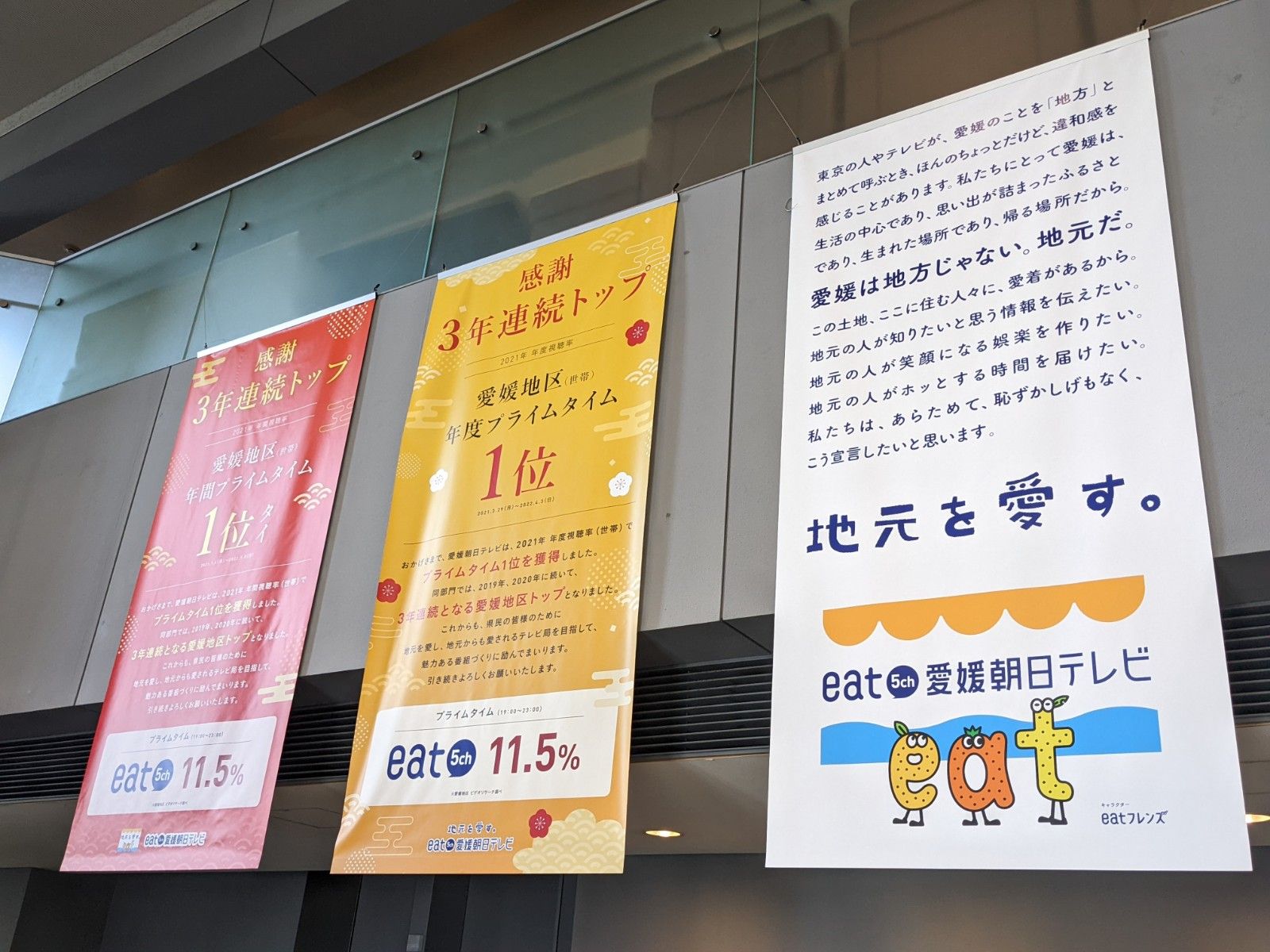 愛媛朝日テレビ局内に飾られる「地元を愛す。」の垂れ幕