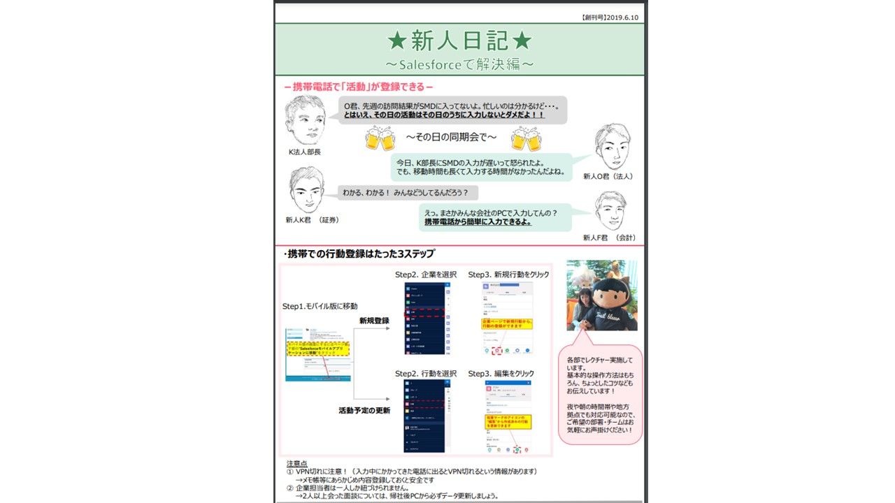 社員の理解促進のため、読みやすい「新人日記」というコラムの作成を開始。社内で寄せられた相談を社員の似顔絵付きで毎週配信・社内掲示し、漫画形式で遊び心がありつつも「こんな情報が欲しかった」という的を射た内容は社内で人気となりました。定着が進むにつれて、現場から「データ活用のためダッシュボードを一緒に作成してほしい」といった前向きで能動的な要望も増えていきました。社内研修では部長がダッシュボードの活用例を解説することで現場への活用方法の拡散にも成功しました。
