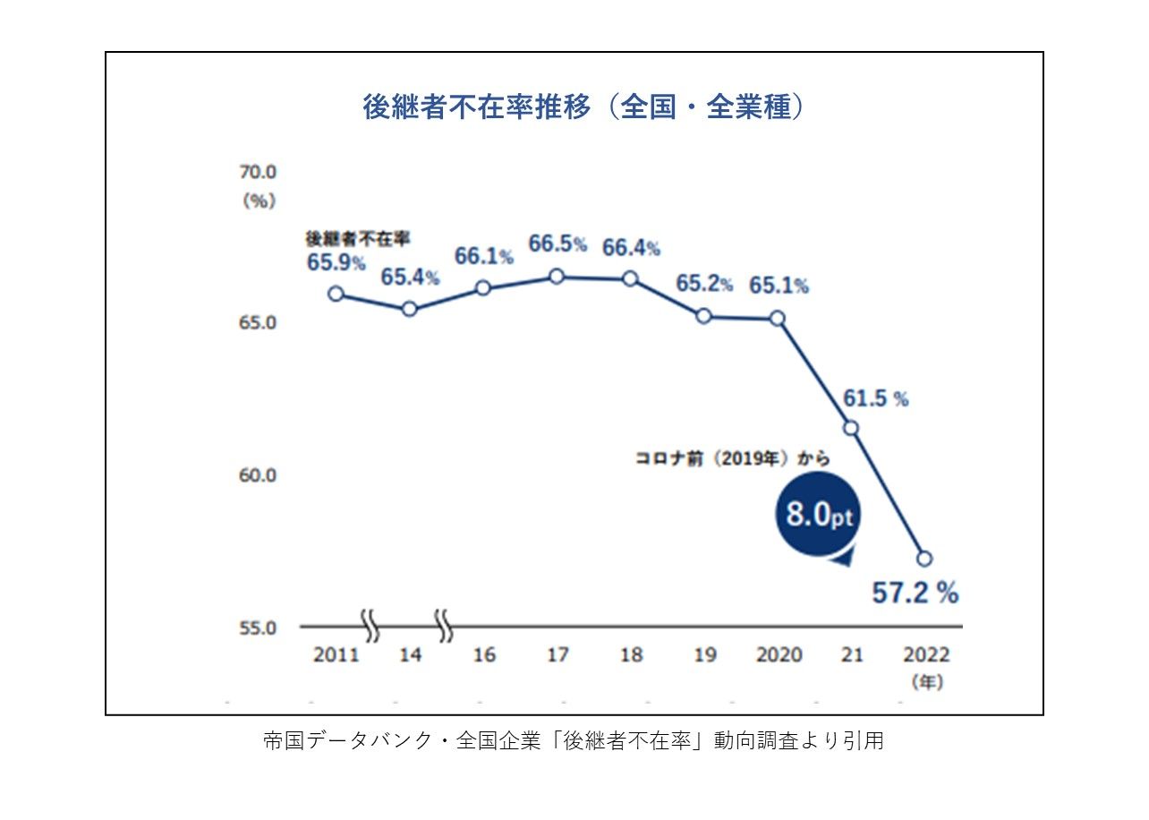 大手信用調査会社の帝国データバンクが2022年11月16日に公表した全国企業「後継者不在率」動向調査(2022)によると、データベースで事業承継の実態について分析可能な全国27万社の後継者不在率が57.2%(前年比4.3%減)となり、調査を開始した2011年以降で初めて60%を下回りました。