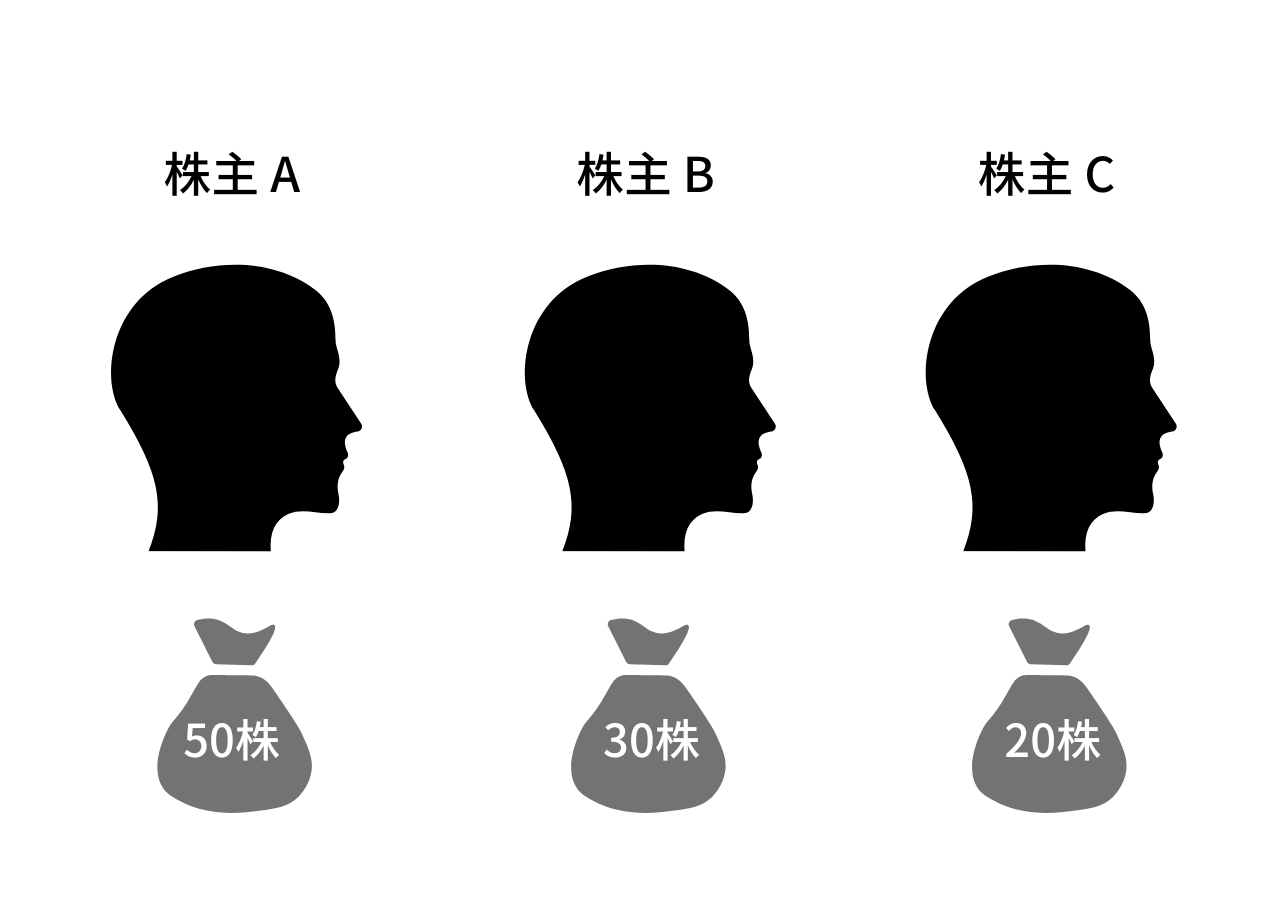会社にはA、B、Cの合計3名の株主がおり、それぞれが50株、30株、20株(1株=1議決権)を持っているとします。