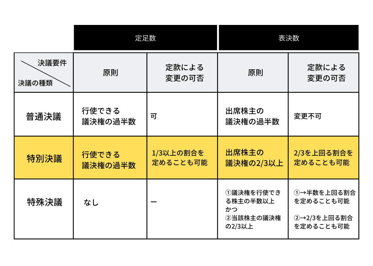 決議要件(表決数)が出席株主の2/3以上となっているため、普通決議と比べてハードルがかなり高く設定されていることがわかります。