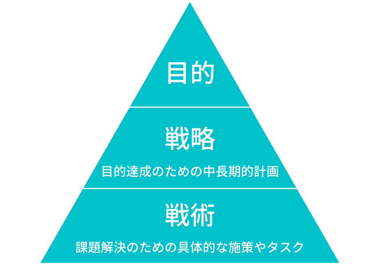 一方、 戦術とは「日々の現場で取り組む、課題解決のための具体的な施策やタスク」の意味で用いられています。