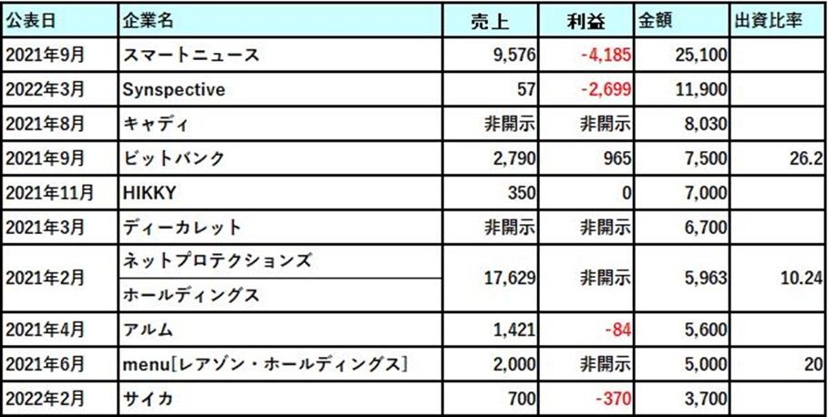 以下の図は2021年1月~2022年3月迄の間のITスタートアップ企業の資金調達額上位10社をまとめたものです。利益が大きくマイナスにも関わらず、数十億円規模の調達に成功している企業も存在することがわかります。推定となってしまいますが、いずれも100%価値に換算すると100億円以上のバリュエーションとなっている可能性が高いものと思われます。