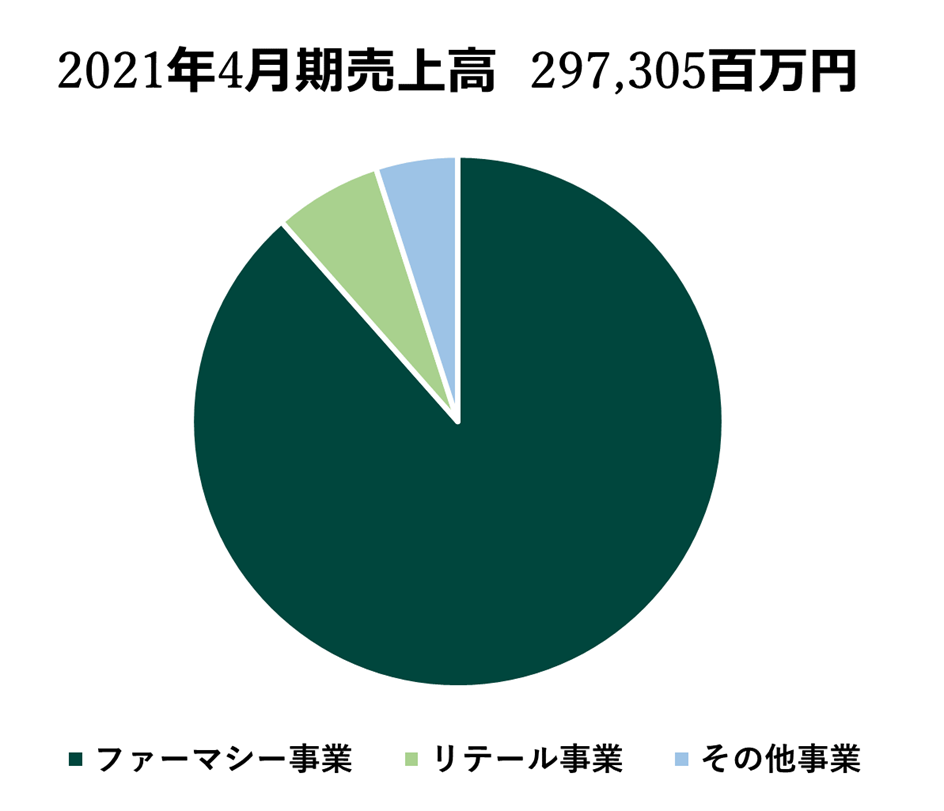 アインホールディングスは、調剤事業をメインに行う企業としては最も大きい売上高を誇っており、2021年4月期の売上高は2,973億円となっています。売上高構成比は、調剤薬局1,065店舗を展開する主力のファーマシー事業が2,631億円、コスメ&ドラッグストア69店舗を展開するリテール事業が194億円、その他事業が148億円を占めています。