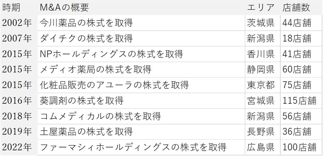 M&Aに積極的に取り組んでいく方針を立てた約1年後、同社にとって大きな転機となる今川薬品とのM&Aが行われ、2003年3月期には当時最大となる130店舗を擁する調剤薬局企業となりました。
