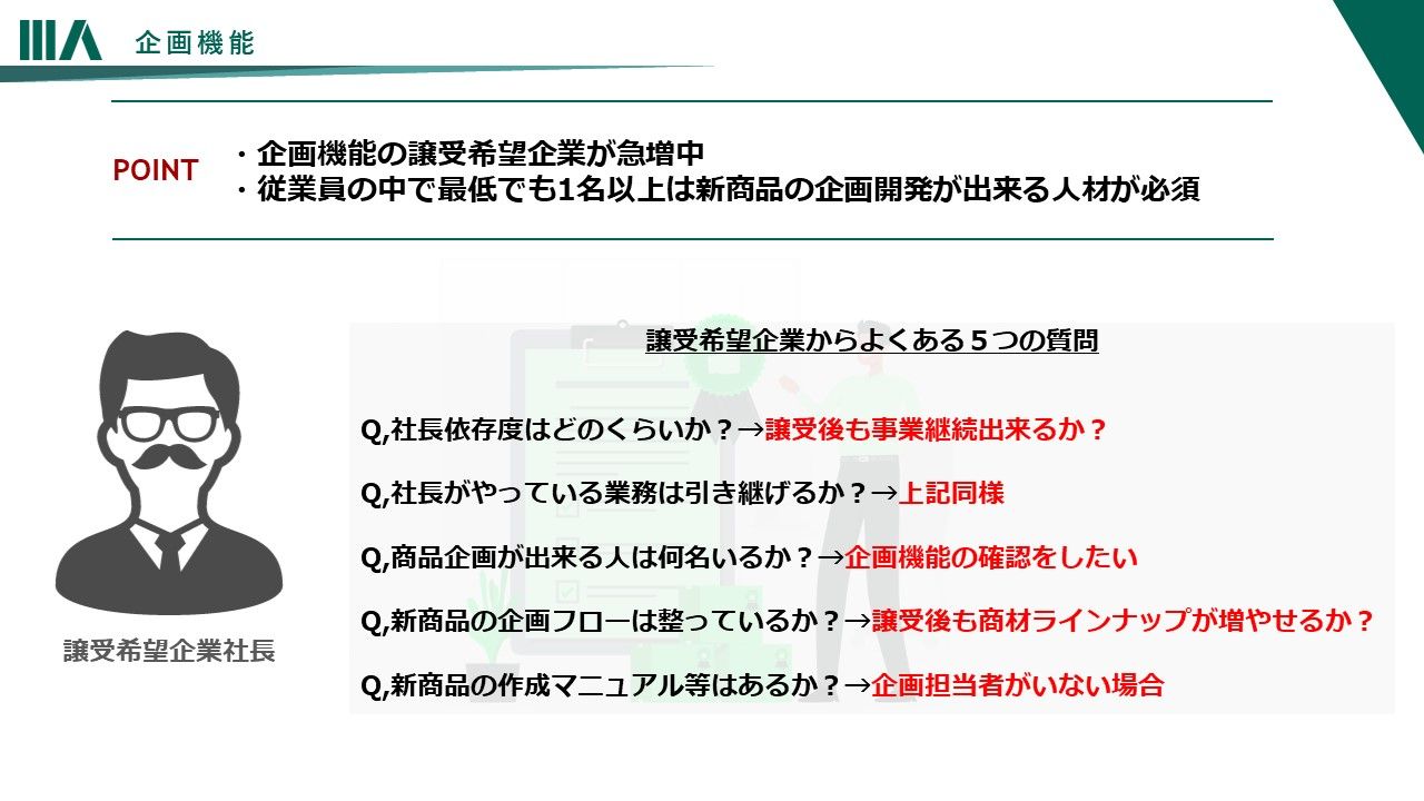 こうしたケースでは、「特定の社員の方にちゃんと任せられるよう引継ぎを行う」「新商品を開発するプロセスを整える」これらをきちんと整備した上で、譲渡されるオーナー様が非常に多くいらっしゃいます。