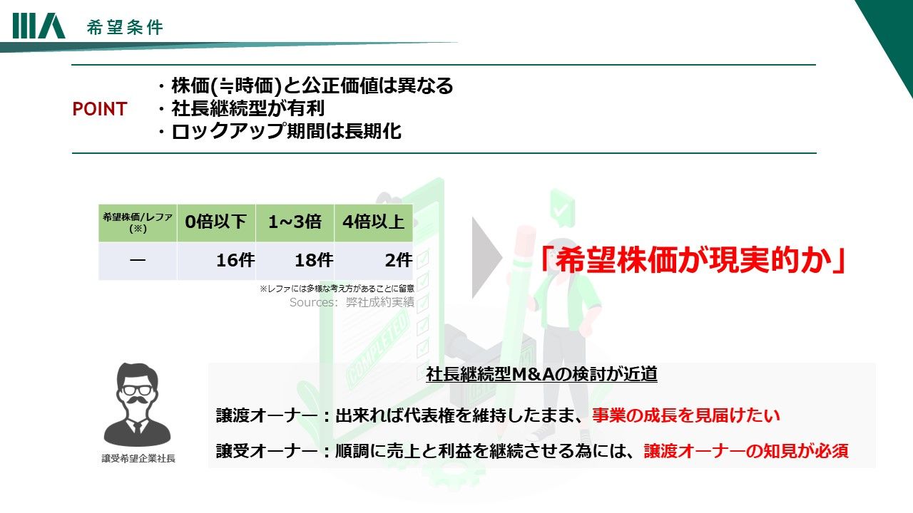 希望株価がありつつも、当然ながら「相手にとってそれが現実的な価格かどうか」の視点が必要になります。