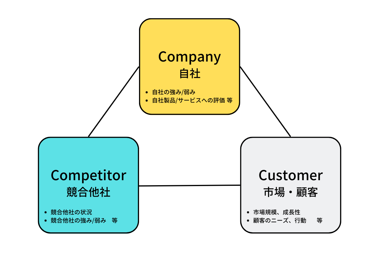 3Cは「Customer(市場・顧客)」「Competitor(競合)」「Company(自社)」の頭文字をとったものです。事業戦略を策定する際には、顧客や競合を含む自社の業界周辺を分析するためのツールとして3C分析が用いられています。