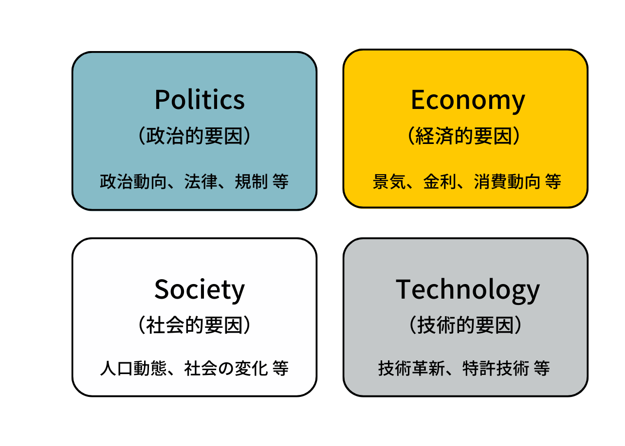 PESTとは「Politics(政治)」「Economy(経済)」「Society(社会)」「Technology(技術)」のそれぞれの頭文字をとったものです。