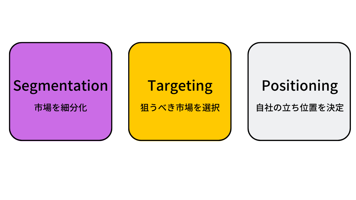 STPとは「Segmentation(市場の細分化)」「Targeting(狙う市場の決定)」「Positioning(有利なポジション)」のそれぞれの頭文字をとったもので、この3つの要素をベースに自社を取り巻く環境を把握し、他社と比べて有利になるための最適な戦略を策定します。