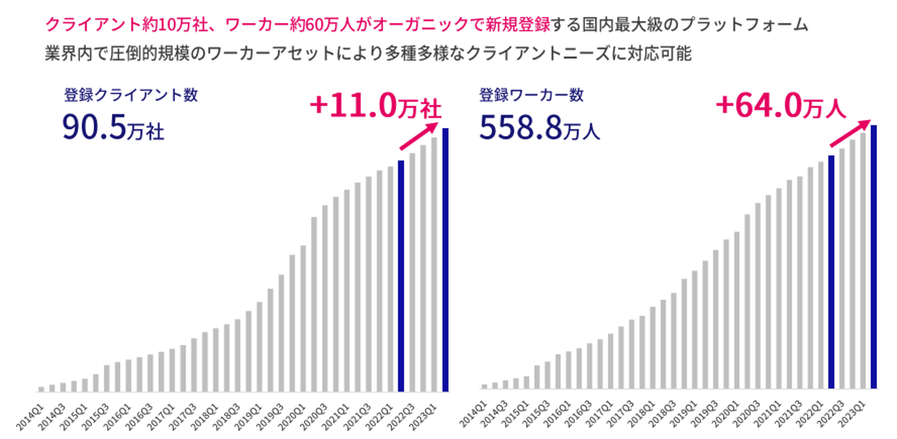 マッチングビジネスは需要側と供給側どちらを先に獲得するべきかという「ニワトリ卵問題」がつきまといますが、「クラウドワークス」は供給側であるワーカーの登録数が圧倒的に多いので、需要側であるクライアントのニーズには誰かしら応えることができます。